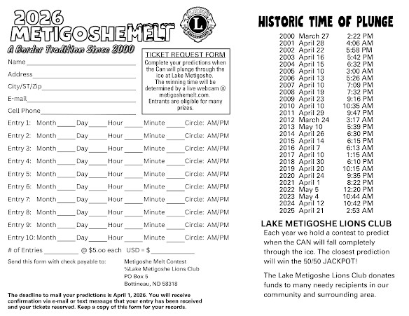 The deadline to mail your entries is April 1, 2026; the envelope must be postmarked on or before April 1, 2026. Mail your list of entries along with $5.00 per entry to: Lake Metigoshe Lions Club, P.O. Box 5, Bottineau, ND 58318.